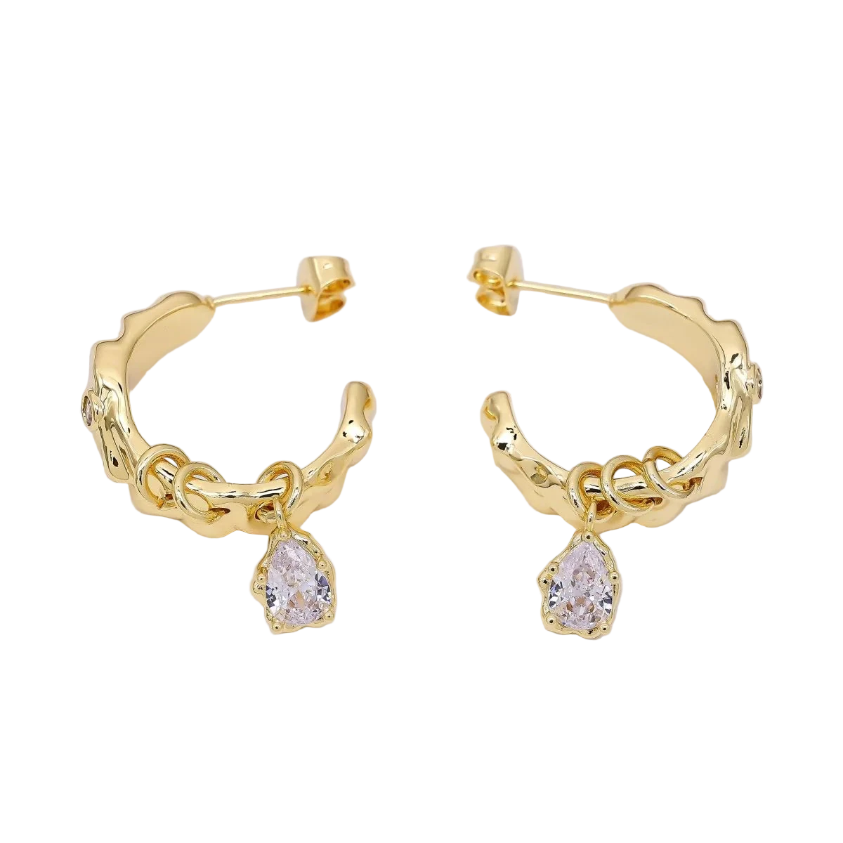 24K Gold Filled 21mm Clear Teardrop CZ Molten C-Shaped Hoop Drop Earrings